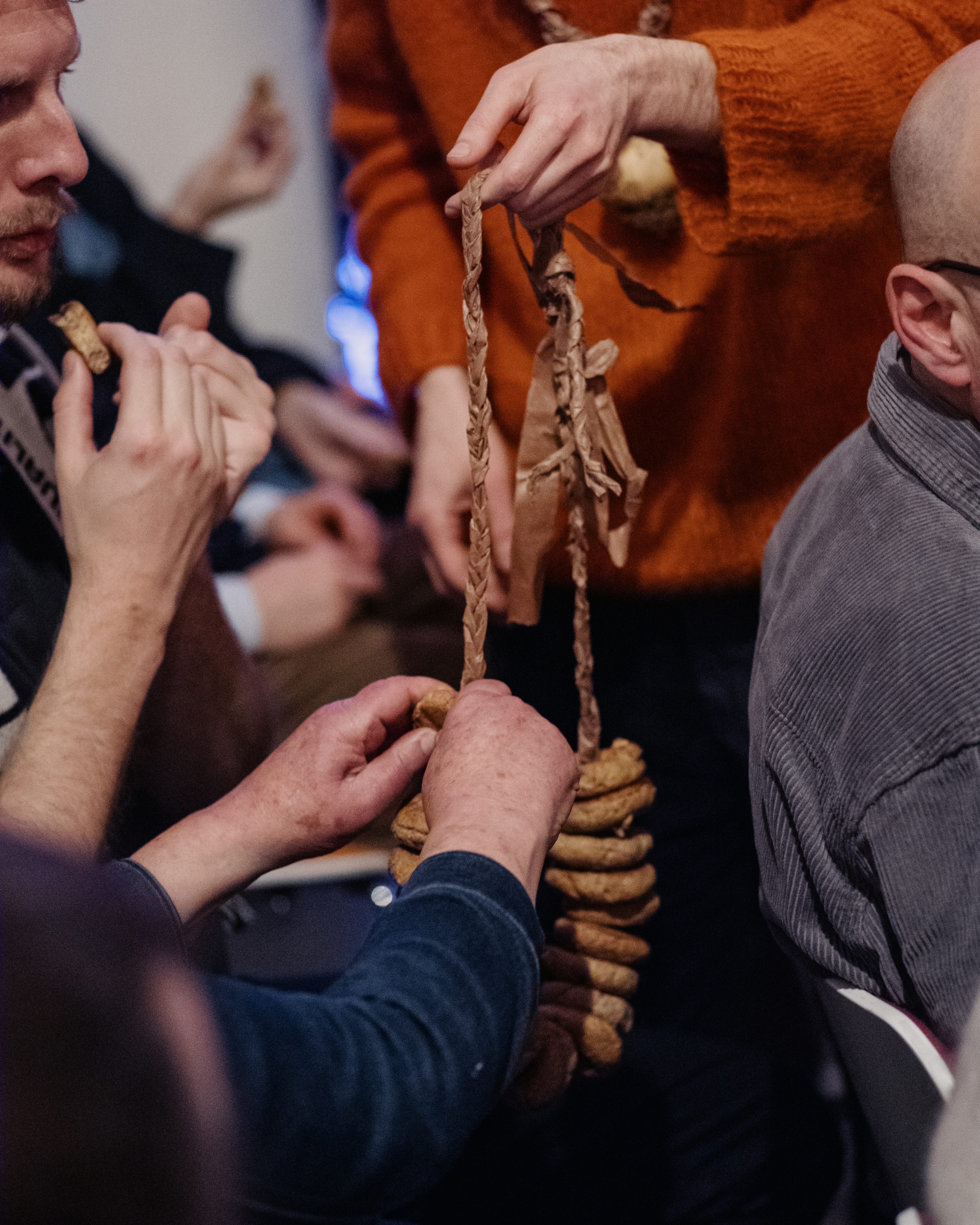 During the performance, David, Julie, and myself wore necklaces made from garlic strands braided twisted, and intertwined that carry both charm and protection. In Ladino, ajo also means “eye,” reflecting its role as a guard against the evil eye.