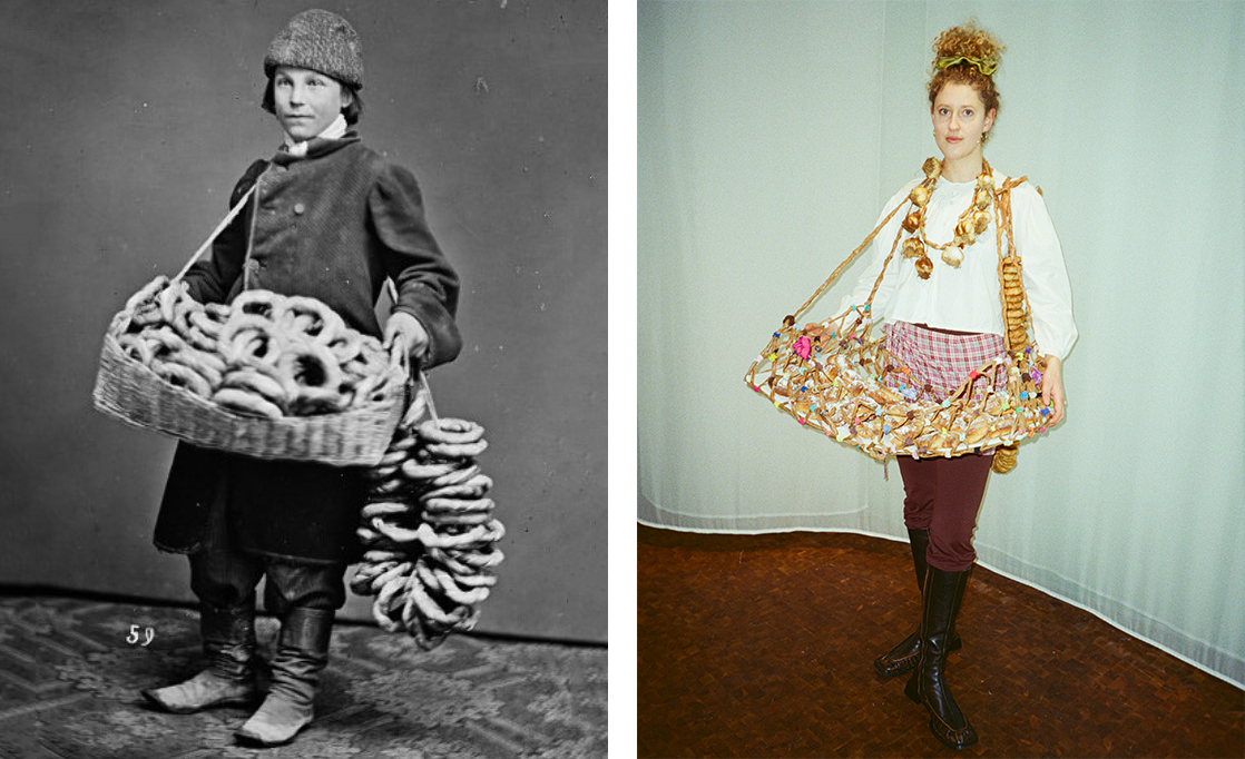 I was carrying a mobile food distributor. Inspired by historical images of market vendors in Eastern Europe, I carried a basket made out of knots by Veerle Melis, a garlic necklace, and strings of sushki around my shoulders, as I walked in spirals while distributing the food to the audience.